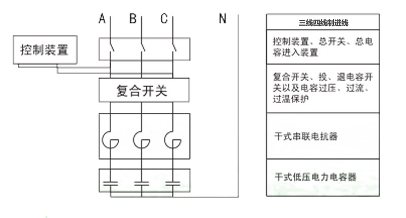 抑諧式低壓無功補償裝置由低壓電力電容器、干式串聯電抗器、智能組件、零投切開關電器和各種傳感器等組成,左圖是一種分相式產品的工作電氣原理示意。