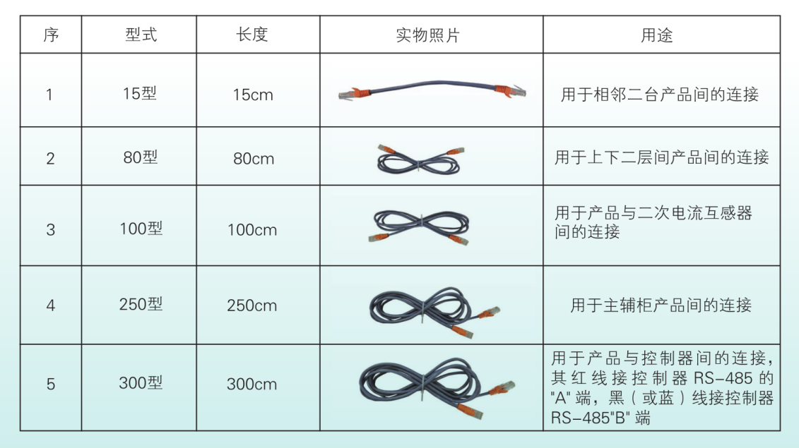 信號連接線用于智能低壓無功補償裝置相互之間或者與外設之間聯機進行信息交換。采用二端帶插頭的線纜,連接時不需要接線,僅將線纜兩端的插頭插入相鄰兩臺產品的RJ45端口中即可