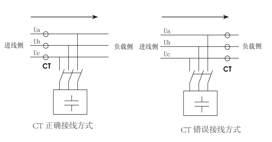 電源端接線有電源線和電流互感器(CT)二次側接線兩種。電源端接線應防止兩種錯誤,一是將無功控制設備與電流互感器(CT)在線路上的位置搞錯。